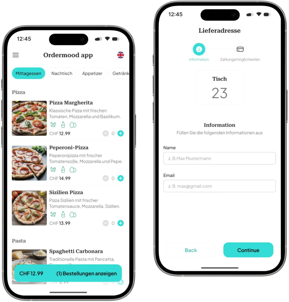 Selon votre configuration, Ordermood peut être utilisé sur place (ex. via QR code), en takeaway. Les clients commandent en quelques clics, paient directement depuis leur smartphone et ne doivent plus attendre l’addition. Résultat : moins d’attente, moins de charge pour le personnel, et un service plus fluide en période de forte affluence.